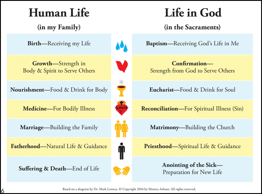 Sacraments are visible signs that bring about invisible realities. So how is the body a sacrament? It is a visible sign that brings about the invisible reality of you! As much as I am my body, I also have a soul. This union of the physical and spiritual exists in our bodies and points directly toward the sacraments. If we handle sacraments with the deepest reverence, this understanding of the body should lead us to treat our own bodies, and the bodies of others with a similar reverence.